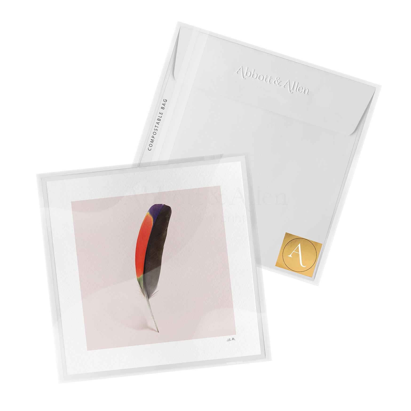 Characterised by its dramatic flashes of colour, this greetings card features a stunning Amazon Parrot wing feather. Our Amazon Parrot wing feather greetings card is printed on a beautifully textured art stock for a high-quality, natural feel.